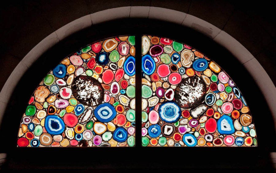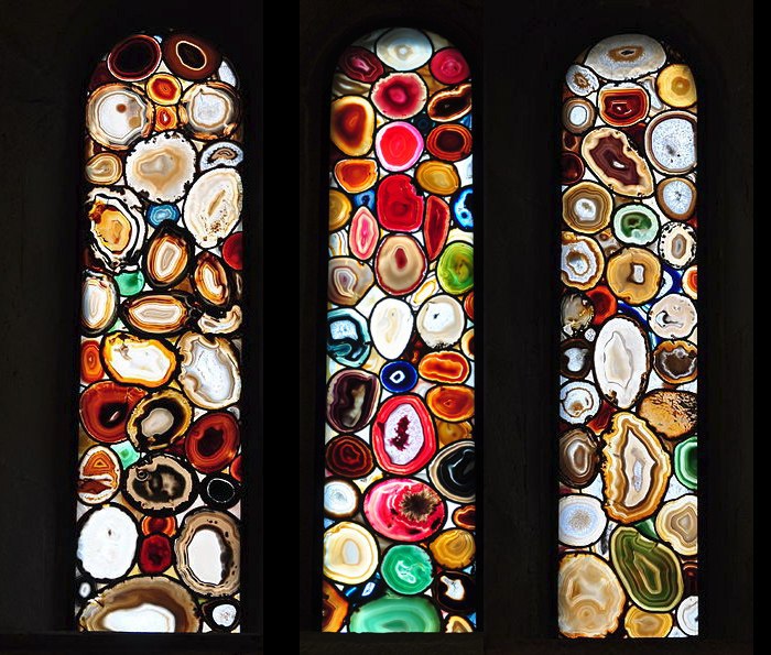 Сам камень - непрозрачный, но пропускает свет в тонких слоях. Имея удивительно красивые окраски и богатую палитру цветов, агат издавна использовался в ювелирном деле. Часто применялся как материал для художественной резьбы. Но чтобы стеклить им световые проемы... До этого еще никто не додумывался!